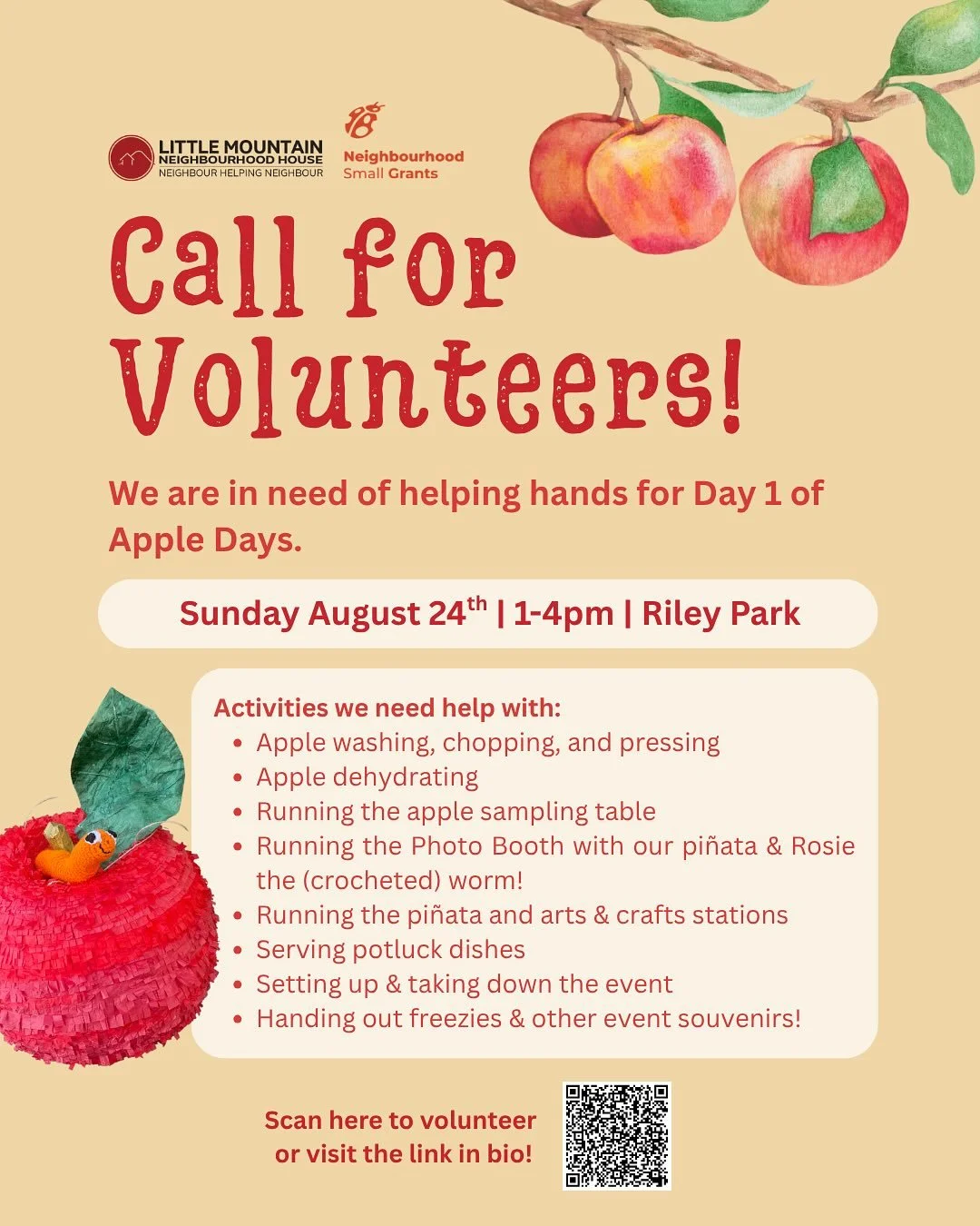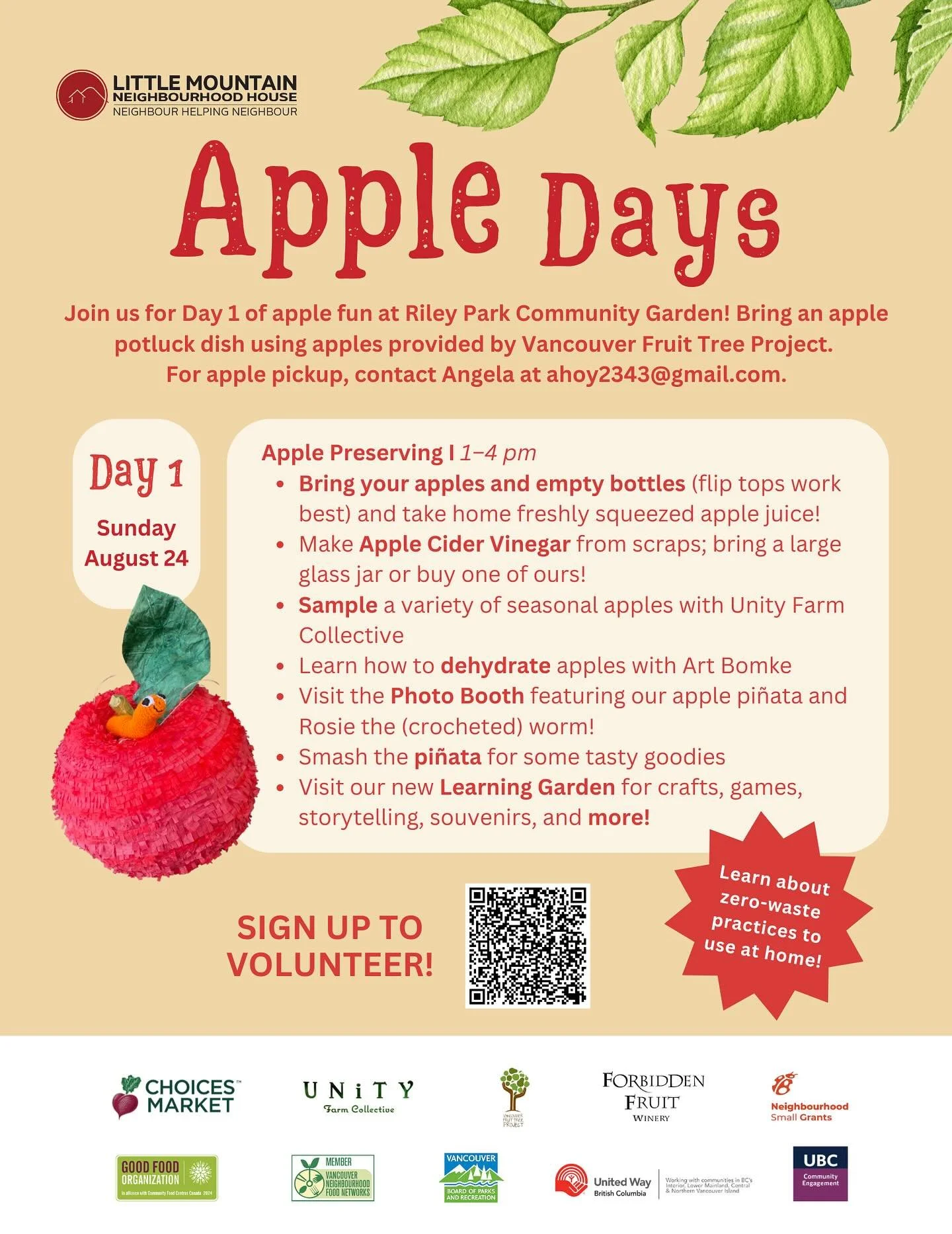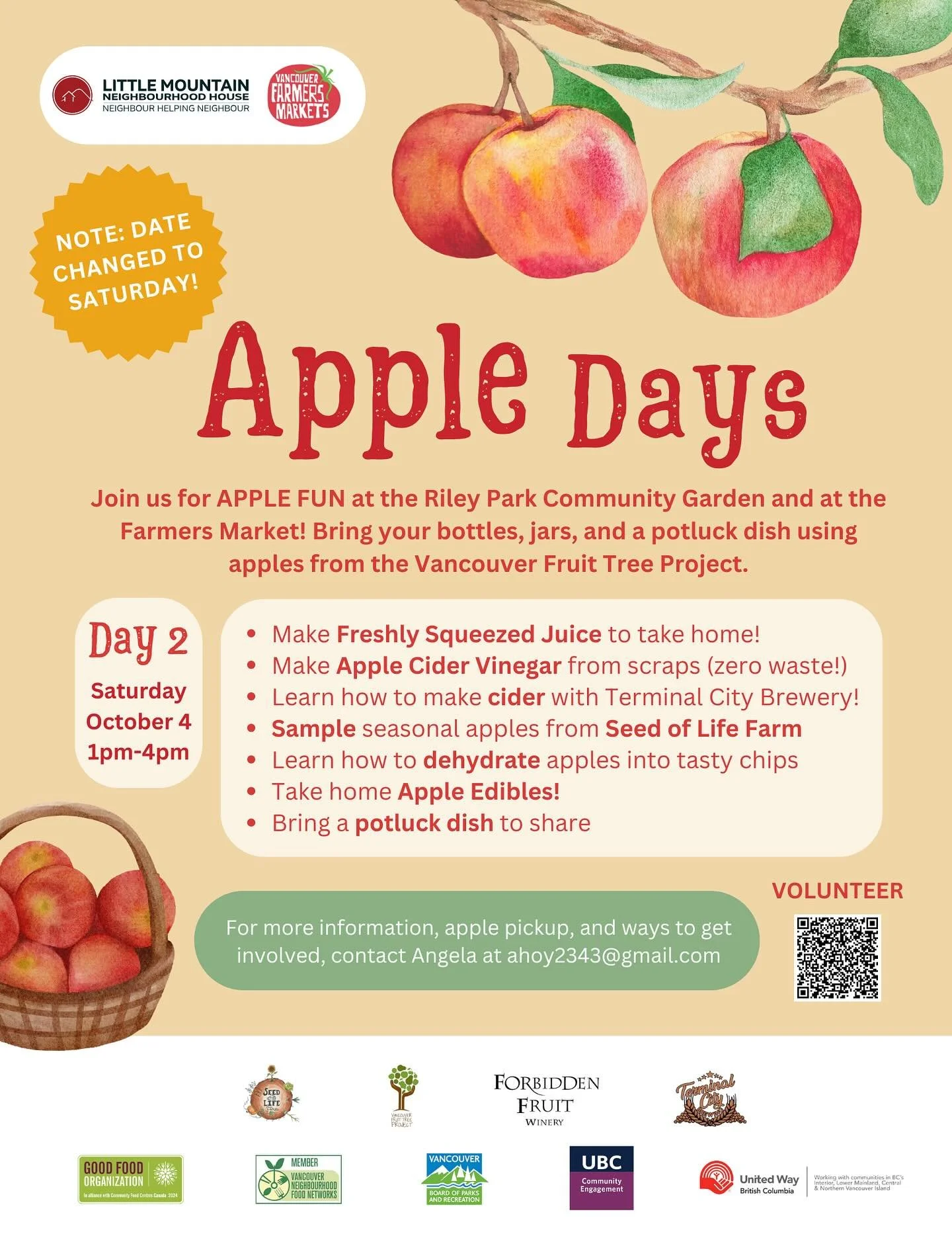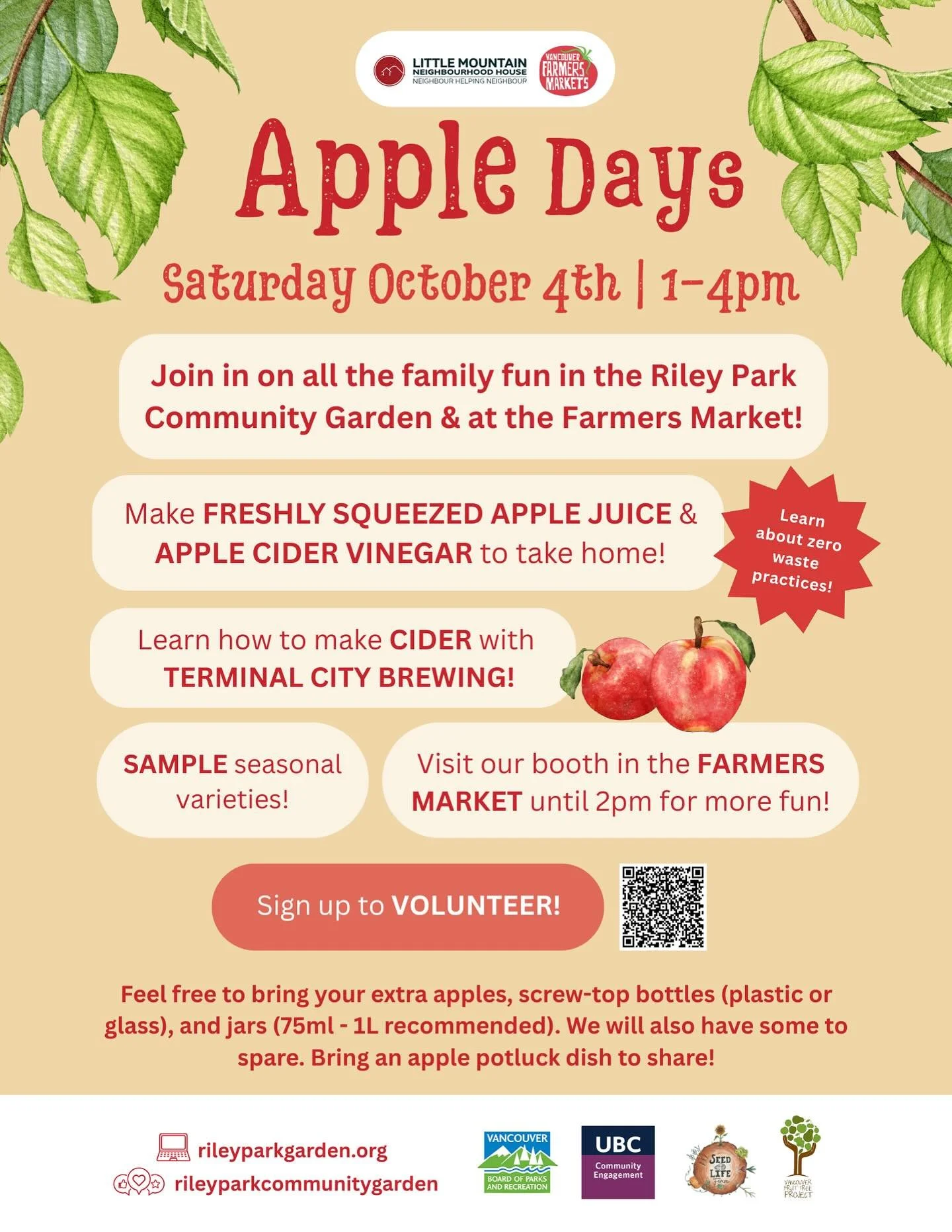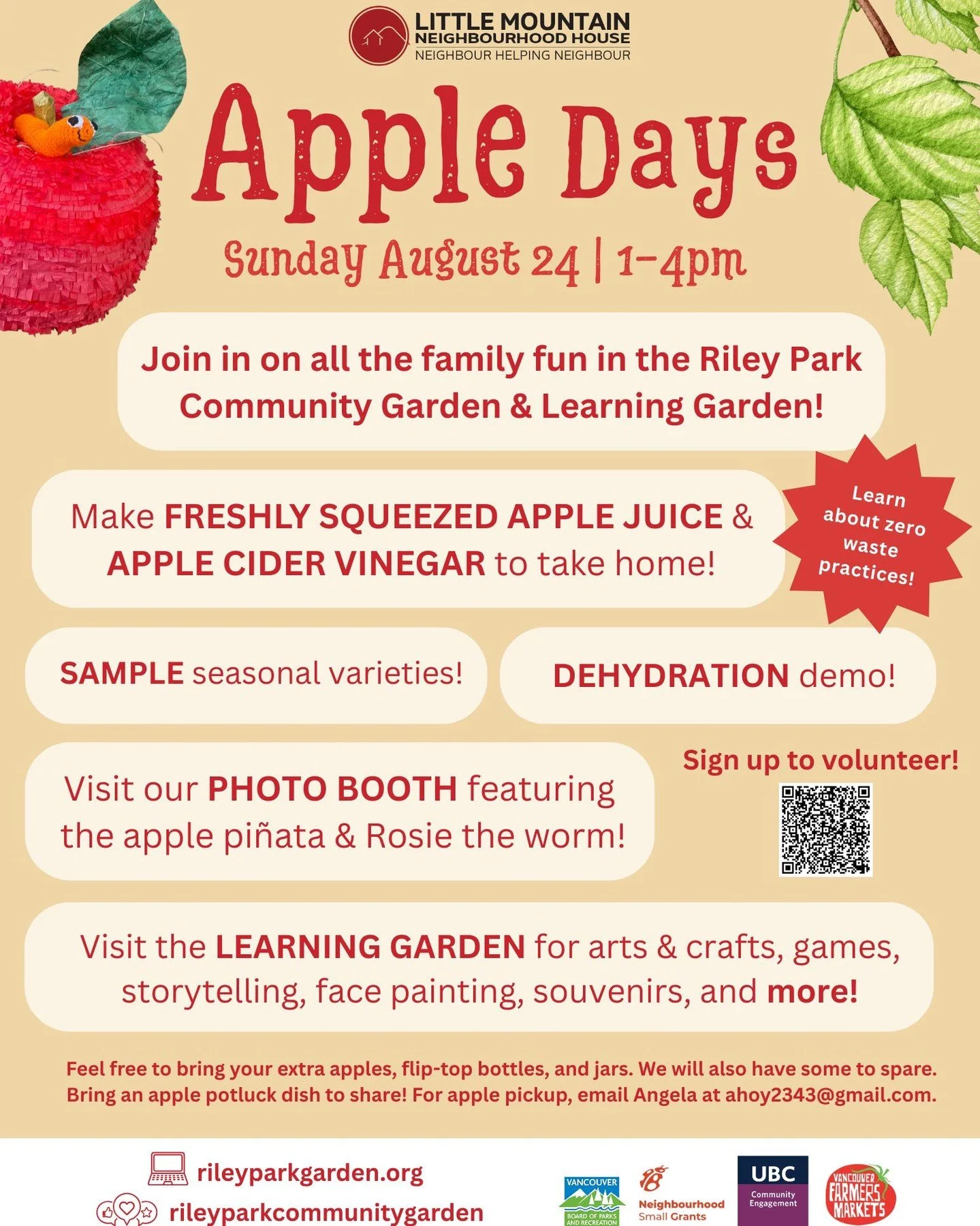 Join us and volunteer at Apple Days and our Garden Work Parties! Save the Date: Sunday, August 24th, 1-4pm, in Riley Park Community Garden & Learning Garden. Volunteer for all or part of the day to help set up and run our various activities.