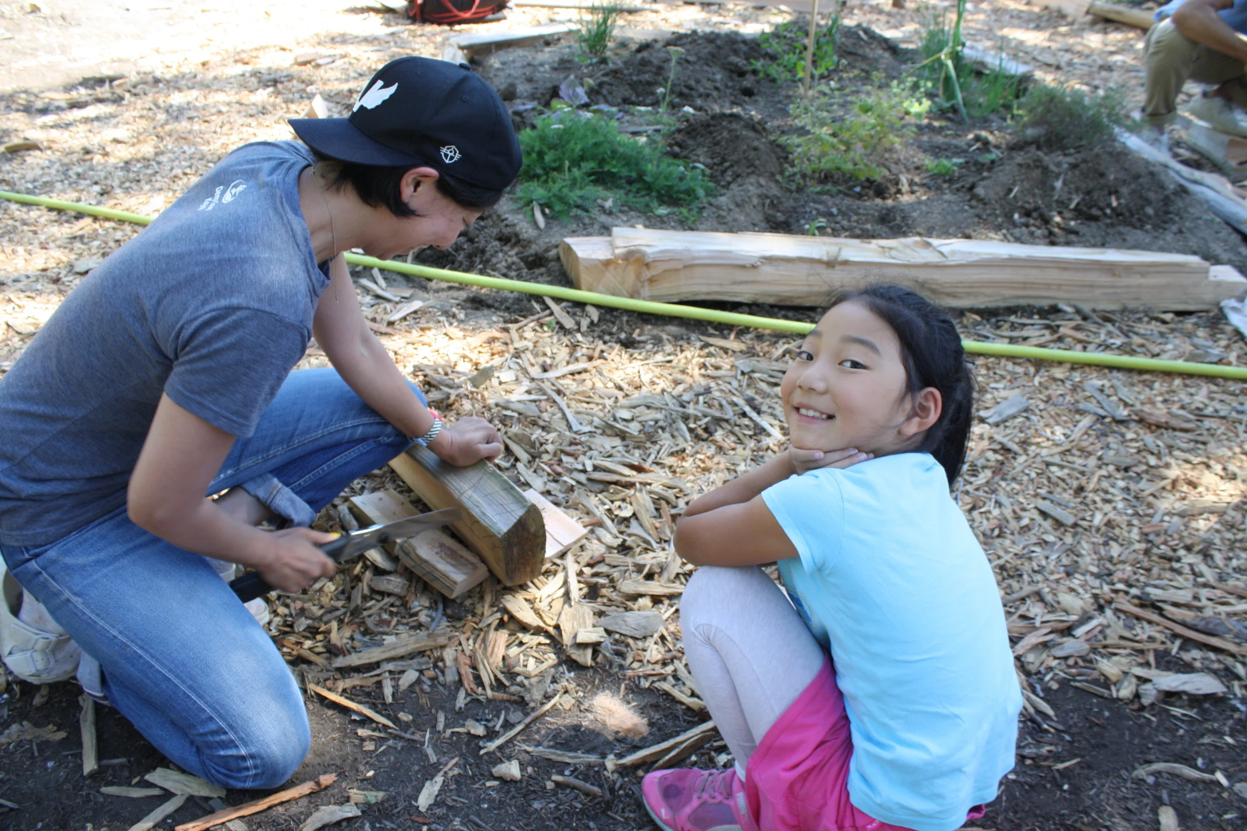 Hard at work creating herb garden borders out of reclaimed wood!